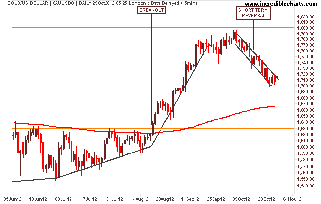 As for the index itself, its still on trend – but only just. With the US market closed tonight, getting direction for tomorrow will be hard and we may see a short term fall below the trend line before a resumption of the uptrend. This is a very important week in macro markets – non farm payrolls on Friday night and the Presidential election next week…plus the storm….its busy busy busy