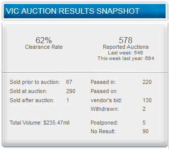 In Victoria, an auction clearance rate of 62% was recorded on 578 auctions reported to the REIV. The result was down on the 66% provisional clearance rate recorded last weekend on 546 auctions, which was later revised down to a clearance rate of 64%. However, it was a big improvement on the 54% clearance rate recorded in the same weekend of last year, although the number of homes auctioned was lower (684 last year).