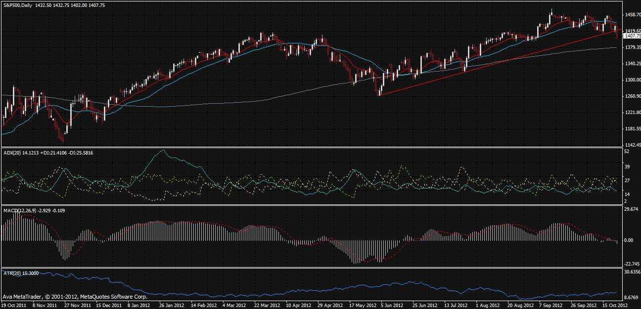 In the US stocks closed pretty much on their lows which will pressure trade in Asia today and in the early European trade this afternoon. The S&P 500 dropped 19 points or 1.34% at 1414, the Dow fell 230 points and the NASDAQ dropped 0.88%.