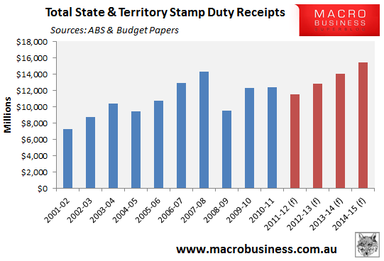 In yesterday’s post, Stamp duty slump to continue, I showed how the state and territory governments’ stamp duty receipts are unlikely to recover as expected over the forward budget estimates due to the ongoing slump in housing transactions (see below charts).
