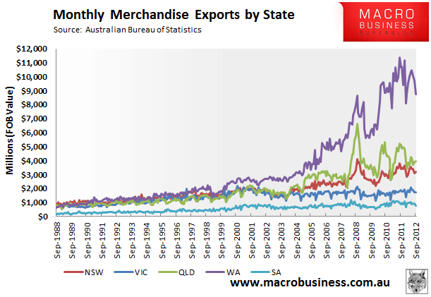 Western Australia continues to hold-up Australia’s trade balance, recording a whopping (albeit lower) surplus of $5,774 million in September, again mostly on the back of iron ore exports (see below chart).