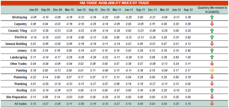 The HIA Trade Availability Index registered +0.15 in the September 2012 quarter, meaning that trades were in moderate oversupply (a reading between 0 and 1 signals oversupply). Meanwhile, the HIA Trade Prices Index eased by 0.3 per cent in the September 2012 quarter to be down by 0.4 per cent when compared to the same quarter last year.