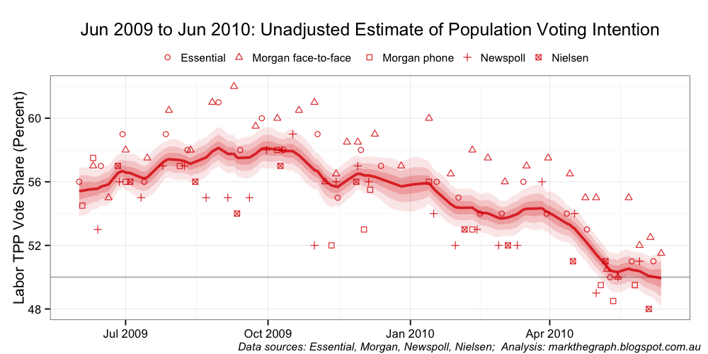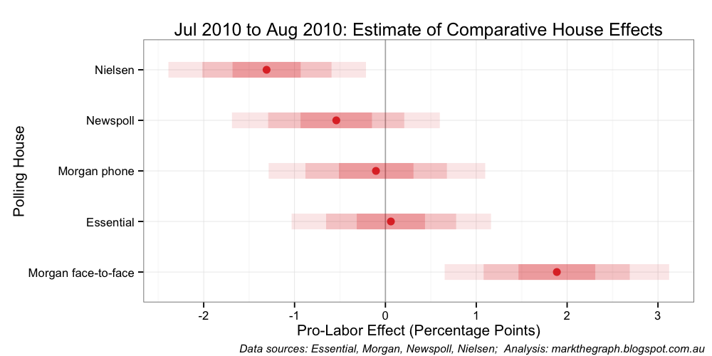 Yesterday, I looked at the house effects in the opinion polls following the elevation of Julia Gillard up until the 2010 Federal Election (actually a slightly narrower period: from 5 July to 21 August 2010). The key charts were as follows.
