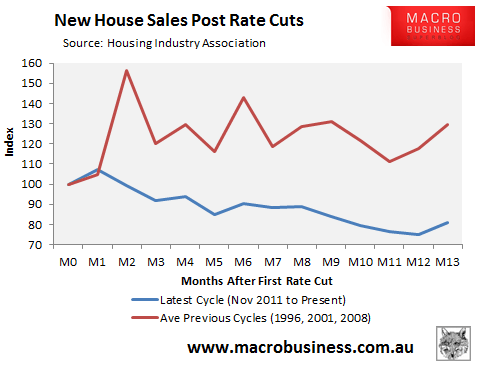 And why wouldn’t they? The RBA/Treasury plan to fill declining mining growth with more houses is not going well. New home sales have tanked since rate cuts started: