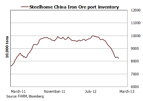 That did not hit iron ore spot, however, supported by a nice rebound in 12 month swaps. And in support of this strength, Friday’s weekly port inventory data again showed no impact from the recent restock, indeed port supplies fell on the week: