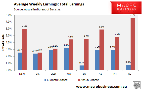 At the state level, wages growth was solid in the six months to November in all states and territories except South Australia and the ACT.