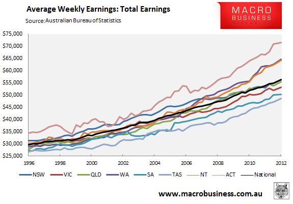 In dollar terms, workers in the ACT, Western Australia, and Northern Territory get paid the most on average, whereas those in Tasmania, South Australia, and Victoria are paid the least: