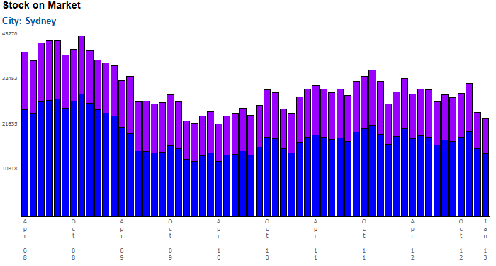 The divergence between Australia’s two largest cities – Sydney and Melbourne – continues, with Sydney stock levels falling sharply over the year (down -13.1%), whereas for sale listings in Melbourne have risen (+1.8% year-on-year). And while the overall number of listings in Sydney is well down compared with recent history, Melbourne’s listings remain highly elevated (see next charts, with houses in blue and units in purple).