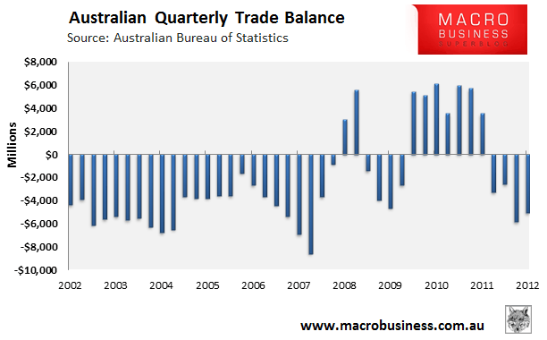 As a comparison, below is the quarterly trade deficit as shown in the December International Trade data released earlier in the month by the ABS. This showed a deficit in the December quarter of $5,081 million, a decrease of $766 million (13%) from the $5,847 million deficit recorded in the September quarter (see next chart).