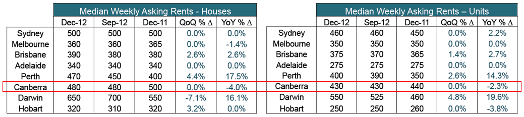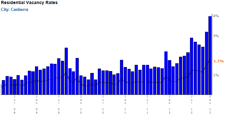 While the boom in dwelling construction has not yet had much impact on Canberra house prices, it does appear to be having a profound impact on the rental market, with SQM Research reporting a large increase in rental vacancies and Australian Property Monitors reporting negative rental growth for Canberra houses and apartments in the year to December 2012 (see below graphics).