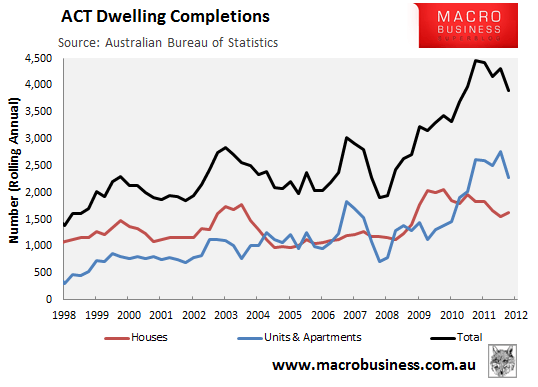 The surge in unit approvals led to a big pick-up in dwelling construction across the ACT, with the annual number of new homes constructed peaking in September 2011 and remaining highly elevated as at September 2012, according to the ABS: