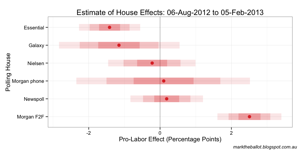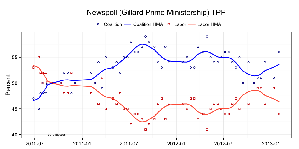 While “rogue” (at least in part) would be my hunch, there is currently no way of knowing for sure. We will need to see a few more polls before we can form an informed judgement on this particular poll. Nonetheless, such a dramatic movement in this Newspoll has moved the aggregated poll result (albeit less so).