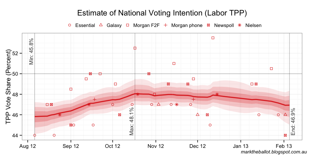 Last weekend’s Galaxy poll was pretty much unchanged from the beginning of December (which is consistent with the aggregated poll as it was until last week). For the rolling fortnightly poll from Essential (half of which was sampled last weekend and the other half during the previous weekend) we also have a steady-as-she-goes poll result. All of which leaves me wondering, is the Newspoll result a rogue poll?