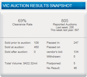 The REIV reported a preliminary clearance rate of 69% on 805 reported auctions. This compares to last week’s final clearance rate of 67% on 176 auctions, which was later downgraded to a clearance rate of 61% on 206 auctions after late results were chased-up. This week’s 69% provisional clearance rate was also much stronger than the 58% clearance rate on 697 auctions recorded in the same weekend of last year and the 65% clearance rate on 249 auctions recorded on the same weekend in 2011. Further, with just over 5% of results missing, the clearance rate will likely hold around current levels as late results are chased-up over coming days.