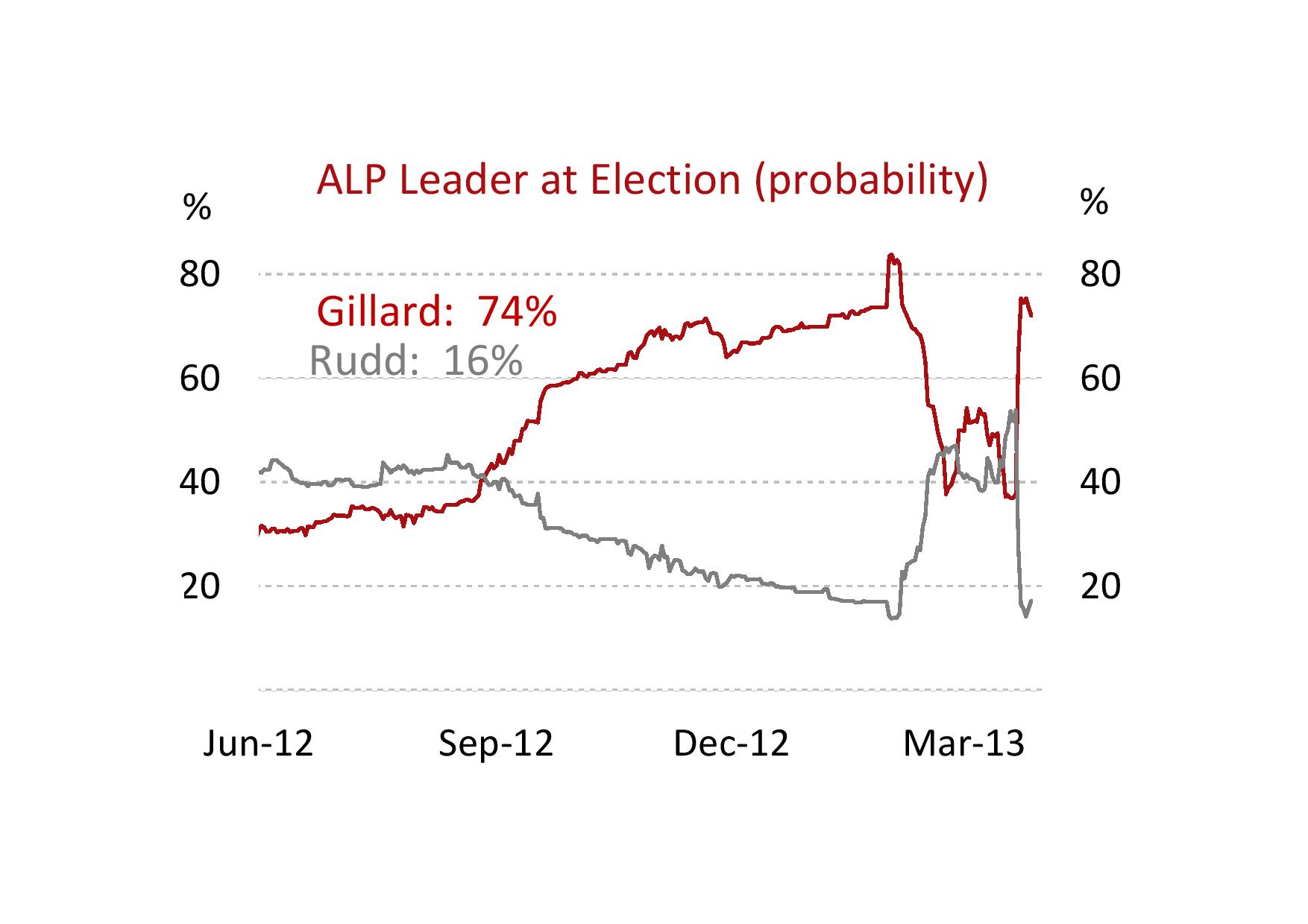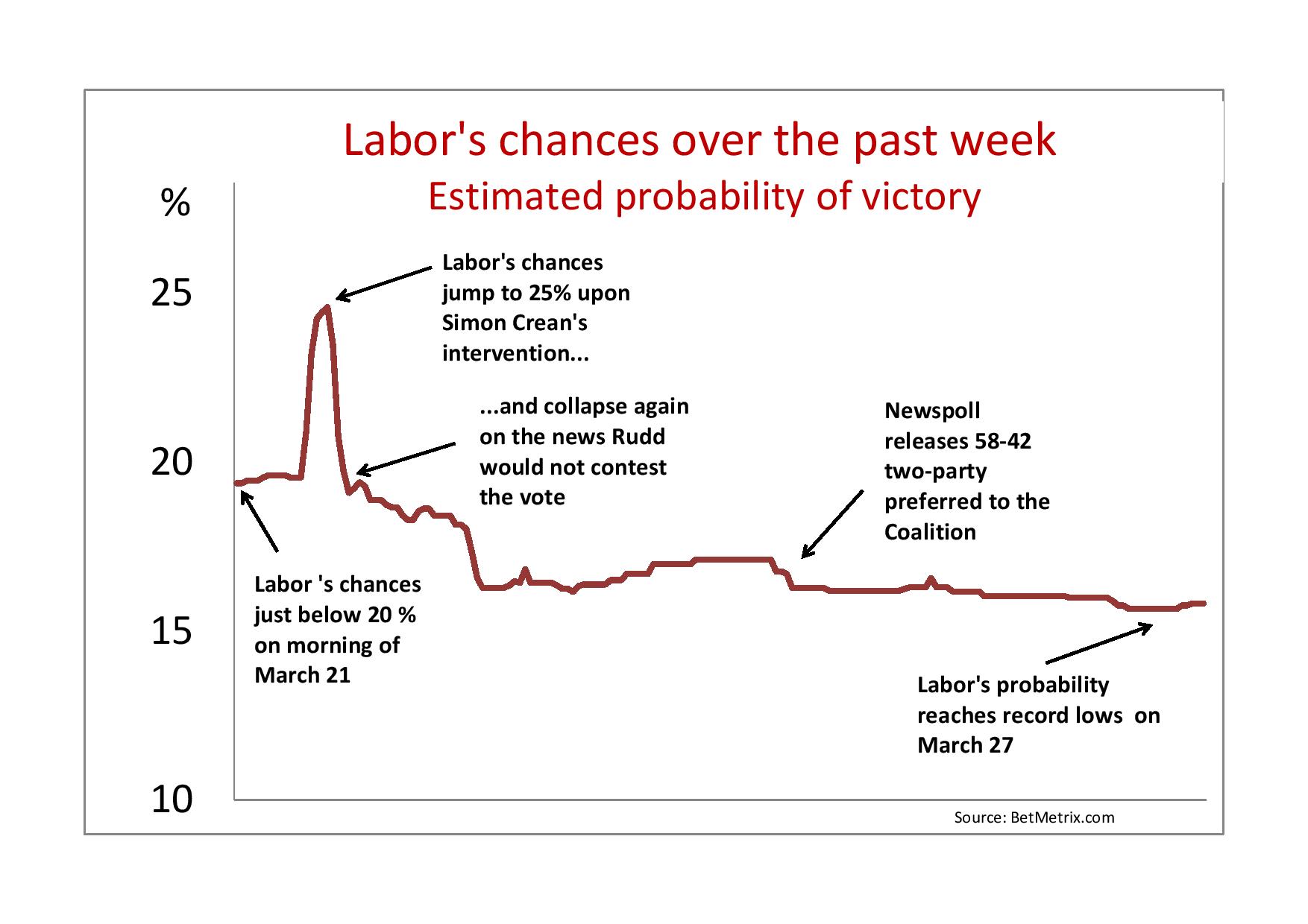 Markets at the time gave Rudd a 3 in 4 chance of being leader, suggesting that, despite later commentary to the contrary, Rudd had a good chance of securing the vote. But ever since the news that Rudd would not be contesting, Labor’s perceived chances have gone into reverse.