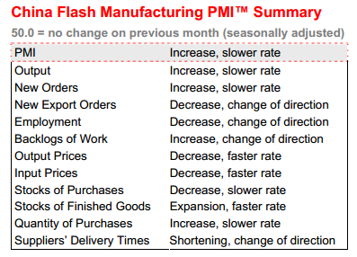 The April Flash PMI for China is out and looks pretty tarnished, down 1.1 points to 50.5 in April. The internals expose moderate local demand but a weakening global economy in falling new export orders:
