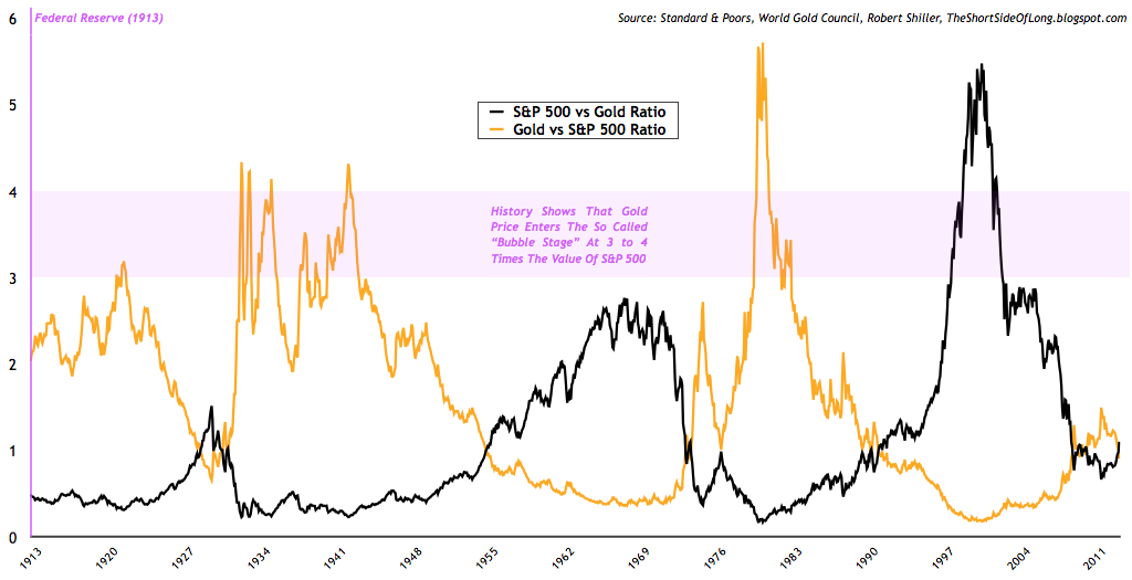 Interestingly, during the 1980 frenzy / bubble / mania / euphoria peak, Gold managed to reach the nominal value of the Dow Jones Industrial. If we look at the chart below, it also managed to reach close to 6 times the value of S&P 500. In my opinion, that is completely and extremely overvalued.