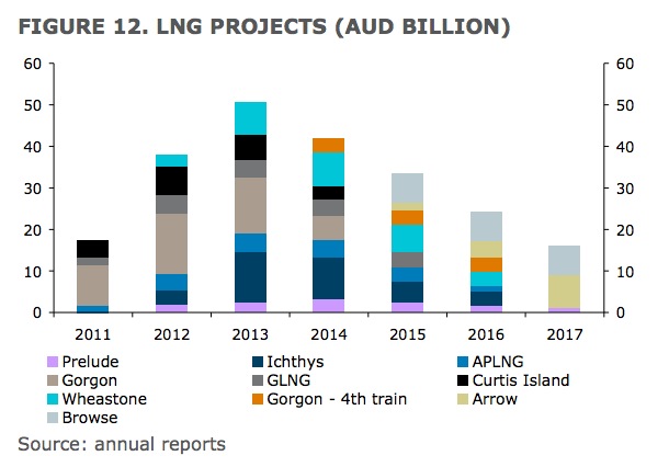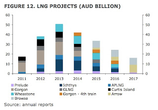 Third – what about all that mining investment? This is a bit more contentious and frankly much more important of a driver of flows in the last year and going forward. Investment continues to be torrid and while the coal sector is desperately looking to cut capacity after an apparent step function change in Chinese thermal power growth and iron ore projects get cancelled the gas sector rolls on. Or does it? Here is ANZ’s pipeline of future projects as of Jan 2013: