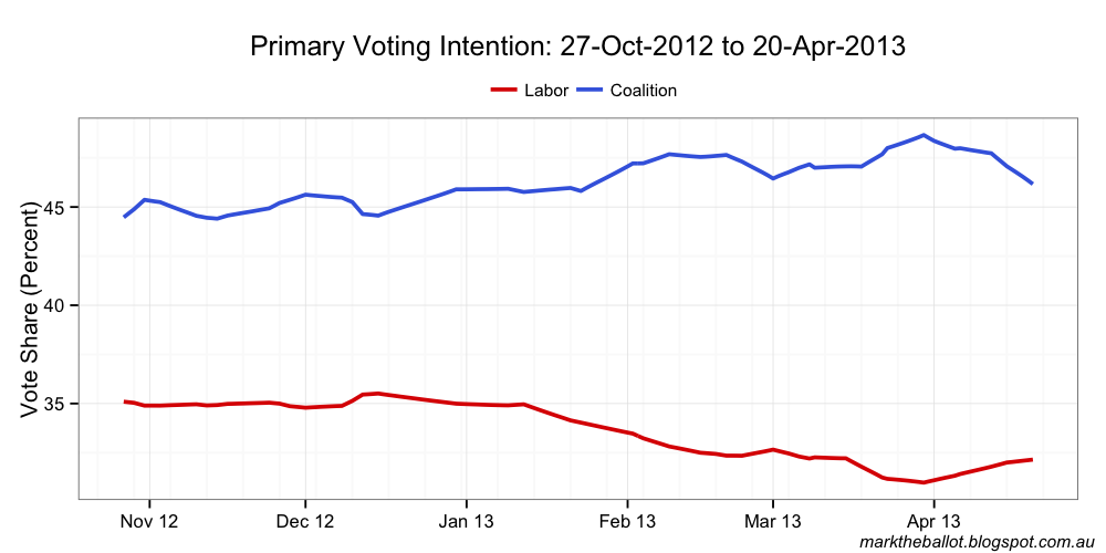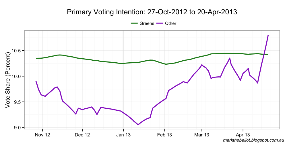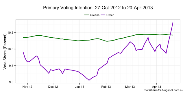 My (albeit more speculative) Bayesian aggregations of the primary vote shares follow. We can see the (so-far, unexplained) movement of primary vote share from the Coalition to other, which was evident in the latest polling results.