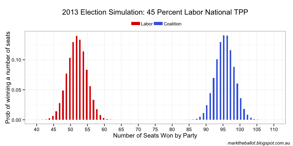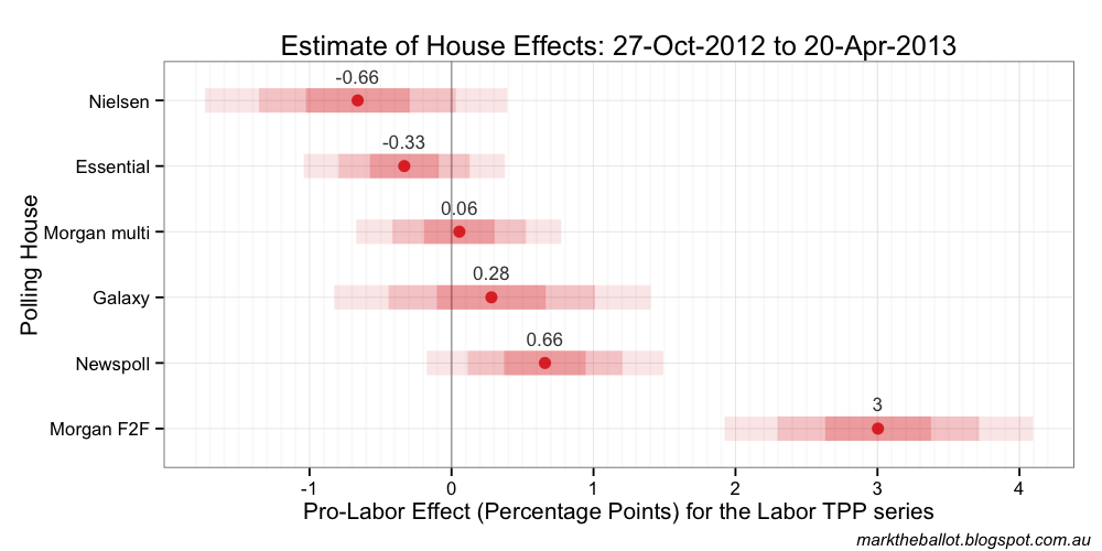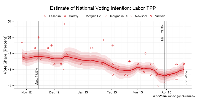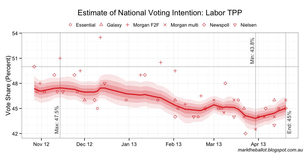 The Bayesian aggregation yields a TPP estimate of 55 to 45 in the Coalition’s favour, which would see the Coalition win around 95 seats and Labor around 52 seats in a Federal election.The aggregation has moved 0.8 percentage points in Labor’s favour on last week.