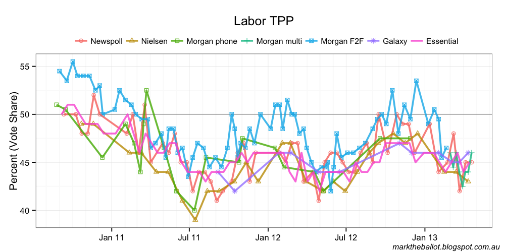 - Morgan‘s TPP estimate moved two percentage points in Labor’s favour (54/46), and the Coalition’s primary vote dropped 3.5 points (from 47.5 to 44). Labor’s primary vote estimate is up half a point on last week (from 32 to 32.5).