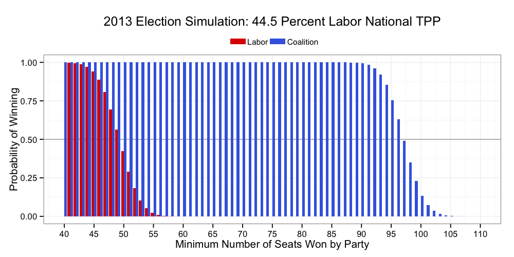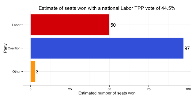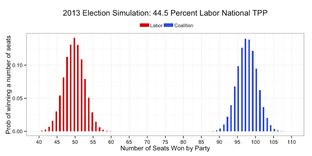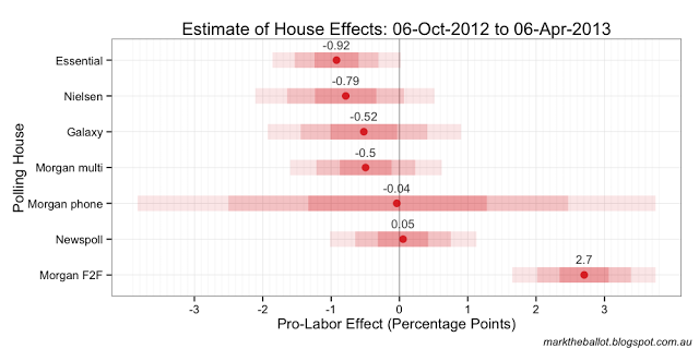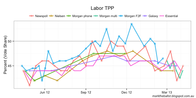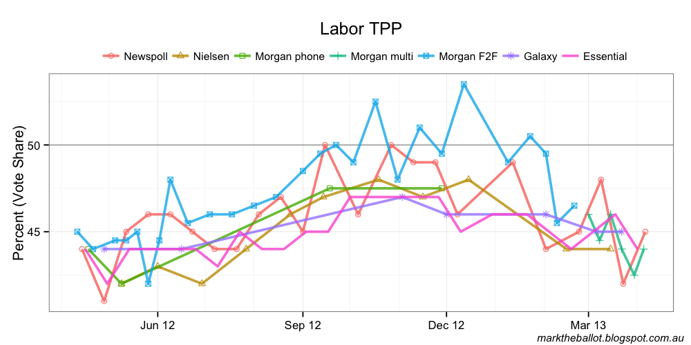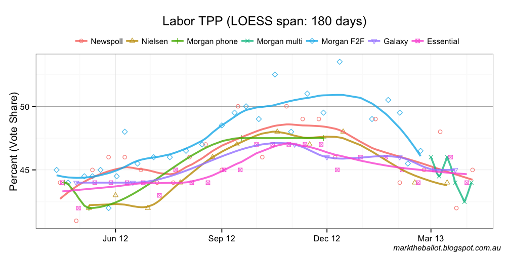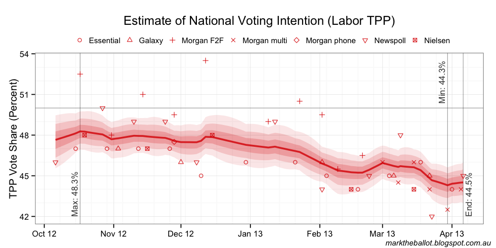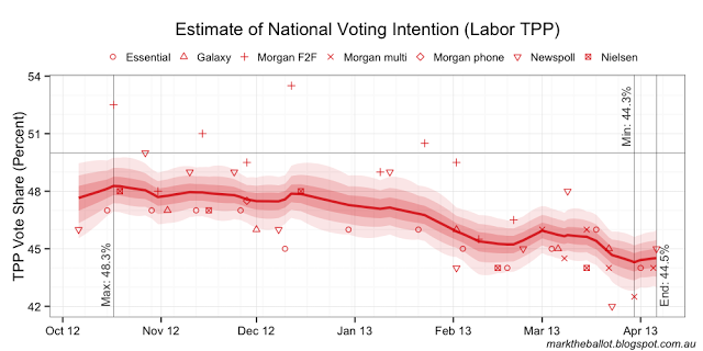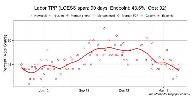 With the benefit of the latest data, the Bayesian aggregation (below) is now treating the two shock results for the government from the last fortnight of March as outliers.