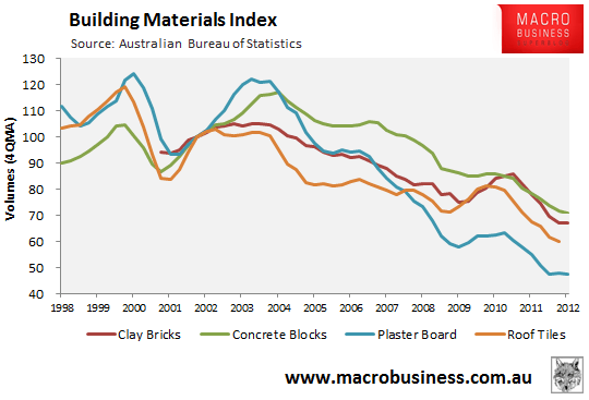 In February, the Australian Bureau of Statistics (ABS) released construction materials volumes data for the December quarter of 2012, which showed continued weakness in the production of concrete blocks, clay bricks, plasterboard, and roof tiles – materials typically used in housing construction.