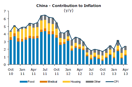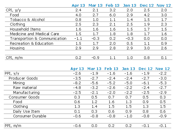Chinese inflation numbers are out and the news is easy on the eyes with the CPI up slightly to 2.4% y/y in April, from March’s 2.1%, slightly higher than market expectations of 2.3% and in a gentle up trend:
