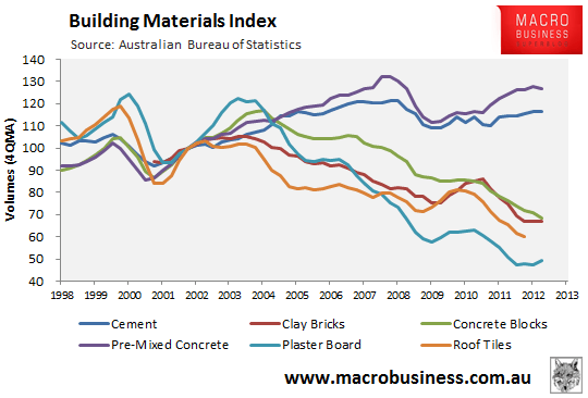 Earlier this month, the ABS released construction materials data, which showed ongoing weakness in the production of concrete blocks, clay bricks, roof tiles, and plasterboard – items typically associated with housing construction (see next chart).