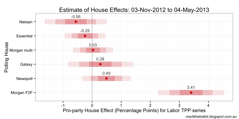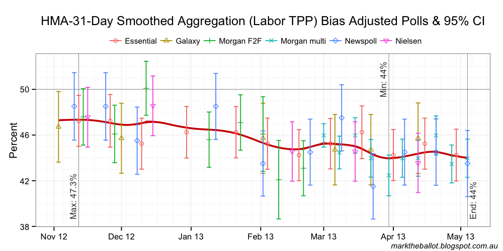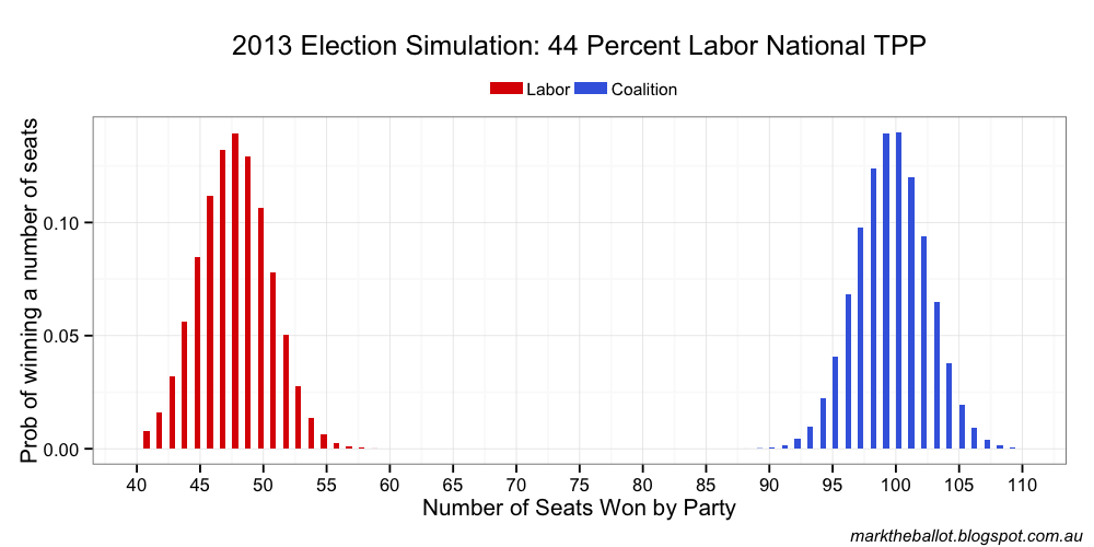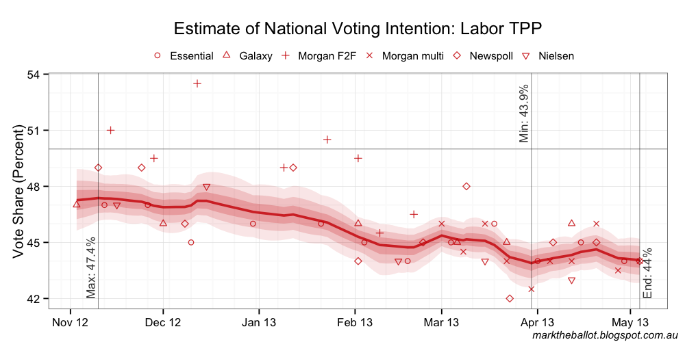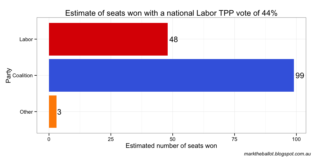 The projected seat outcome for the House of Representatives from the Bayesian aggregation was: 99 seats for the Coalition, 48 for Labor and three for others. The result almost tipped 100 (and indeed, the Henderson smoothed line above did tip 100-47-3).