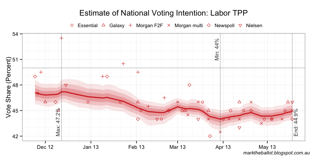 With a fresh Budget to assess, every polling house was in the field searching for a Budget bounce. And you would never read about it, but they found one. The combined message is one of a small bounce-let for the Government. (And this is where I feel a compelling need to utter the following mantra as a public service: don’t confuse correlation with causation. Just because some polls went up, it still could be noise, and even if its real it doesn’t mean the Budget made it happen).