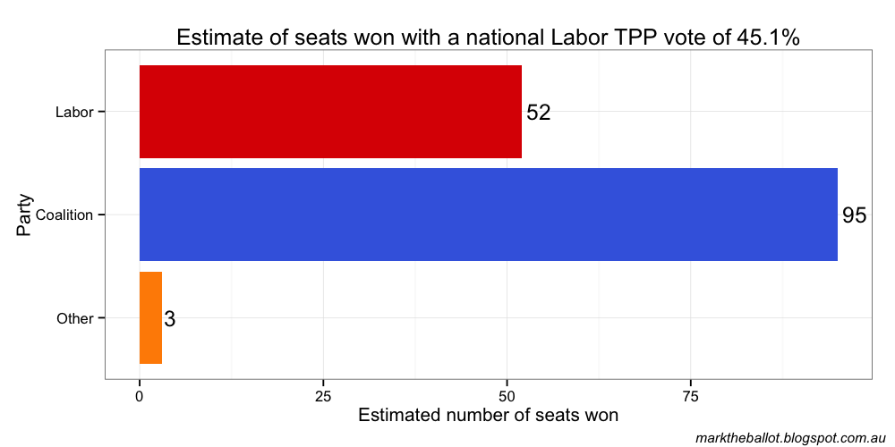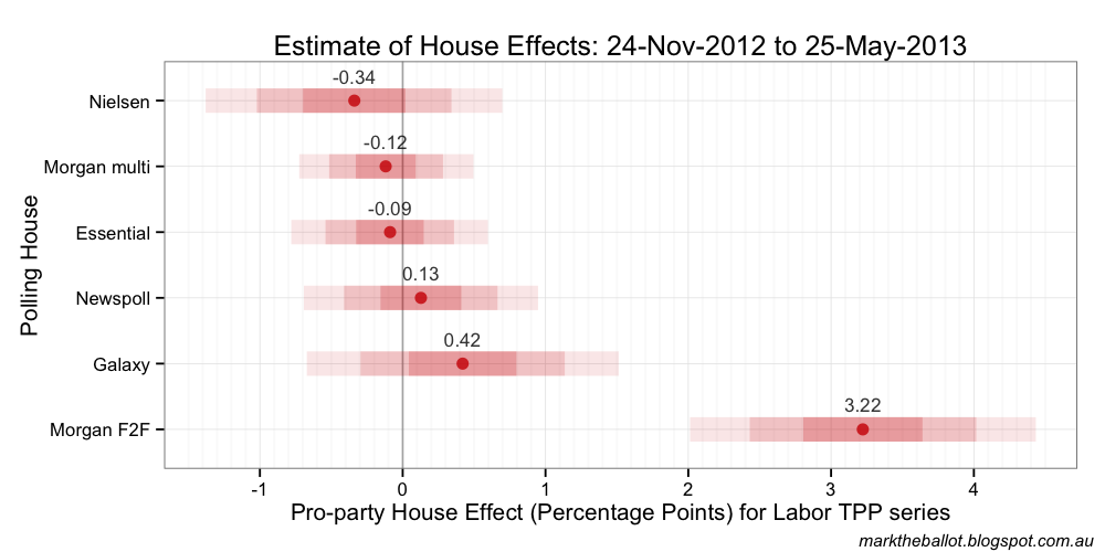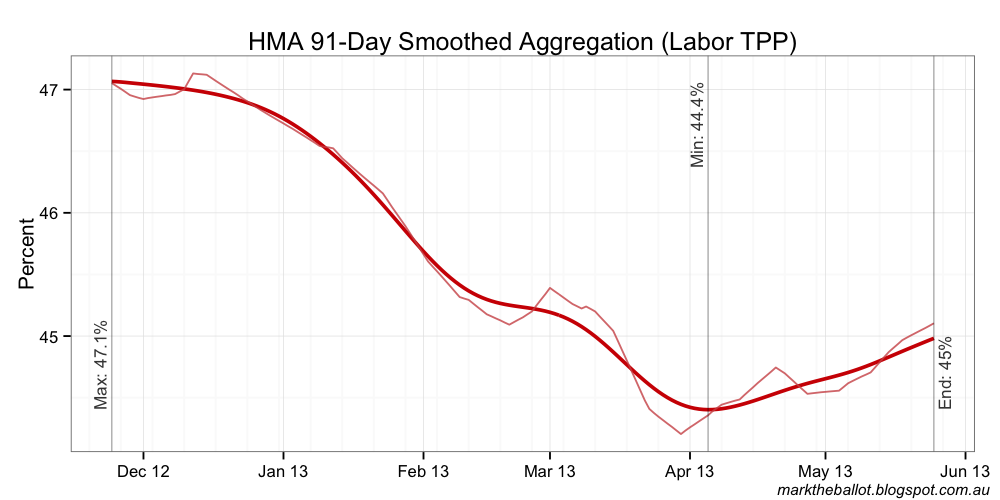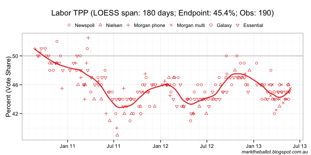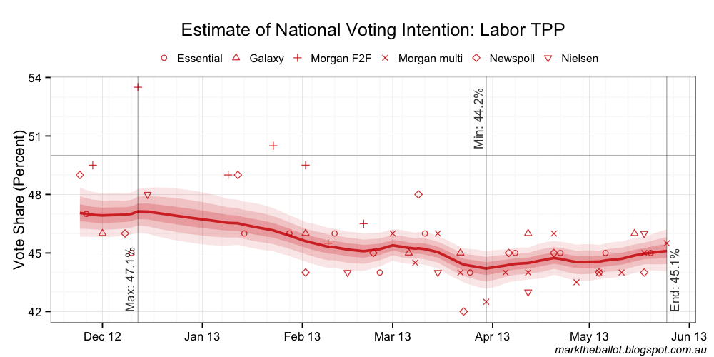 This week we have two fresh poll reports. A status quo report from Essential (45-55), and 0.5 percentage point improvement for the government from Morgan (45.5-54.5). I have ignored the Queensland-only Galaxy poll, which was a shocker for the government (41-59). My model does not include single-state polls of Federal voting intention.