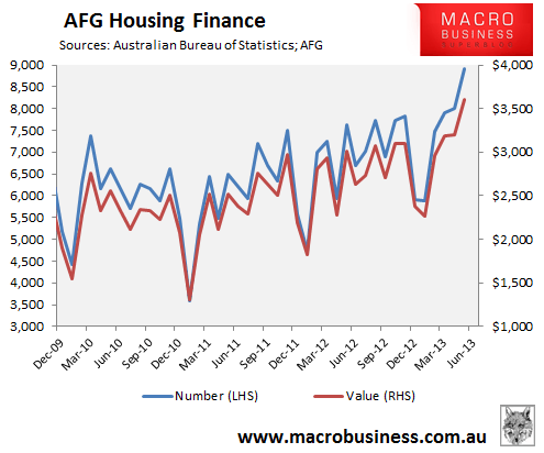 Australian Finance Group (AFG) yesterday released its housing finance data for the month of May, which registered the Group’s strongest monthly mortgage applications on record, with 8,921 mortgage applications (valued at $3,608 million) processed over the month, an improvement of 16.8% on May 2012 (see next chart).