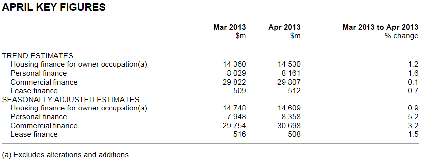 The Australian Bureau of Statistics (ABS) has released Lending Finance data for the month of April, which registered strong seasonally-adjusted rises in personal and commercial finance commitments, but falls in owner-occupied housing and lease finance commitments (see next table).