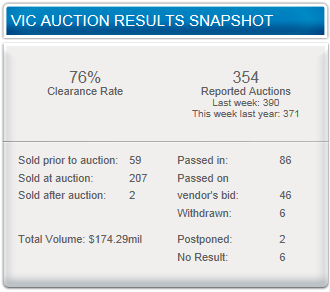 In Australia’s biggest auction market – Melbourne – clearances rose to 76% on 354 auctions reported to the REIV, with only 6 auctions listed as “no result” (see below table).