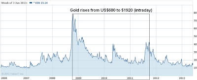 While there isn’t always a direct correlation (with the short term Gold price) the below chart showing the S&P 500 Volatility Index is an easy way to confirm that stock market volatility (one sign of financial instability) was at increased levels while Gold rose strongly over the late 2008 to late 2011 time frame (although Gold was initially liquidated along with others assets earlier in 2008):