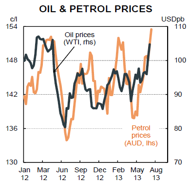 On this basis, the price of crude oil in AUD equivalent has risen by around 30% since mid- April (when the AUD peaked against the USD). This compares with a rise of around 12% in the price of crude oil in USD terms. Over that same period, the price of petrol rose by a small amount. But the price will continue to trend higher over the coming weeks because of the lag between changes in the spot price of crude oil and prices at the pump.