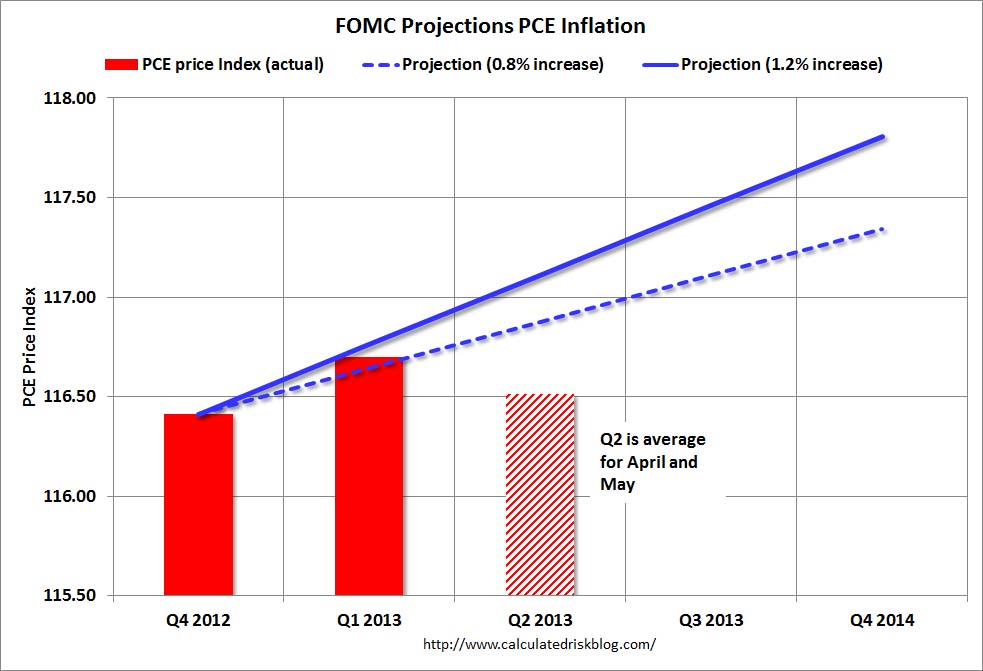 The third graph is for PCE prices.The current forecast is for prices to increase 0.8% to 1.2% from Q4 2012 to Q4 2013.We only have data through May, but so far PCE prices are below this projection – and this projection is significantly below the FOMC target of 2%. Clearly the FOMC expects inflation to pickup, and a key is if the recent decline in inflation is “transitory”.