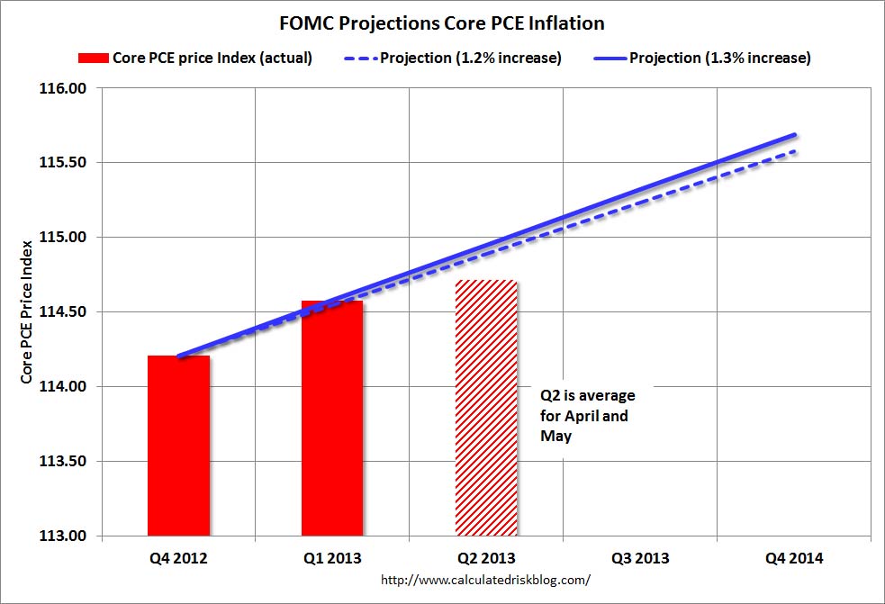 The fourth graph is for core PCE prices.The current forecast is for core prices to increase 1.2% to 1.3% from Q4 2012 to Q4 2013.Once again we only have data through May, but so far core PCE prices are below this projection – and, once again, this projection is significantly below the FOMC target of 2%. Clearly the FOMC expects core inflation to pickup too.It has only been just over two weeks since the FOMC press conference, and all of the data has been worse than the FOMC forecasts (GDP revised down, unemployment rate at high end, prices below forecast). It would be a stretch to say the incoming data has been “broadly inconsistent” with the June FOMC projections, but clearly the economy will have to pickup before the FOMC would meet their “broadly consistent” goal and start to taper QE3 purchases in December. (September tapering seems less likely now since the key data has been worse than forecast, but still not impossible).