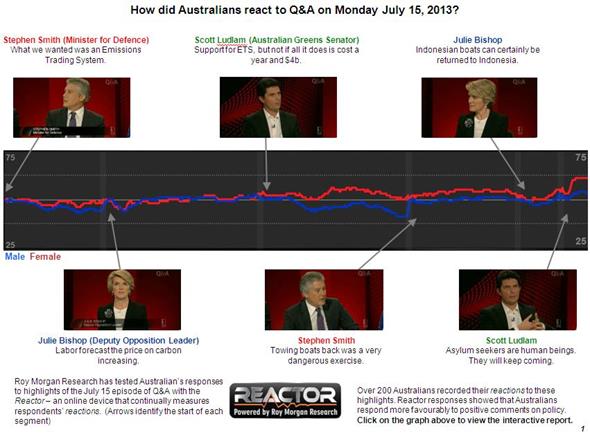 This week, the exclusive Roy Morgan Reactor tested Australians’ responses to the appearance on ABC’s Q&A on Monday night of Minister for Defence Stephen Smith, Deputy Leader of the Opposition Julie Bishop, and Greens Senator Scott Ludlum. As we have seen with previous Reactor tests, direct attacks on opposing parties generated less favourable reactions, whereas clear statements of policy and position tended to have more appeal.