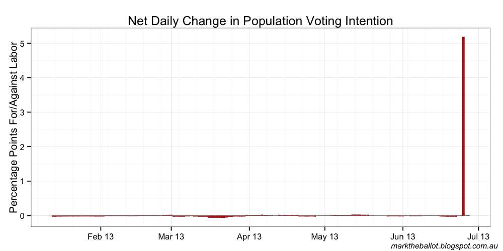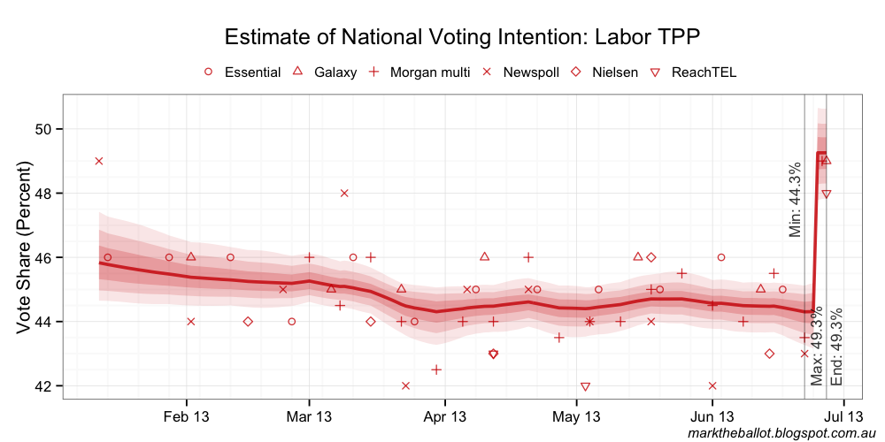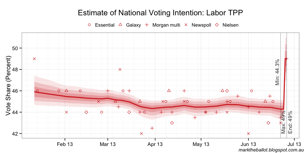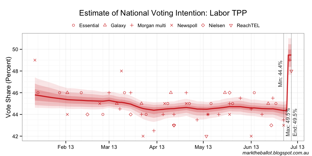 Julian King emailed me today with an update to his model allowing for a discontinuity in public voting intention with the transition from Prime Ministers Julia Gillard to Kevin Rudd.Clearly, circumstances require me to make a similar adjustment to my Bayesian aggregations.I have used the snap Morgan poll to test my updated aggregation with the Gillard-Rudd discontinuity. This is only a test, as the latest Morgan poll is an SMS poll (not the multi-mode series the Bayesian aggregation expects). I will back-out this SMS data from the model when further polling data becomes available.Anyway, I thought it would be interesting to provide the charts from this test, as well as the JAGS code I am using. It certainly suggests a much more competitive election contest. With all the caveats of data inconsistencies, and only having the results from one poll, our very early estimate of the Rudd Resurrection effect is 4.7 percentage points.