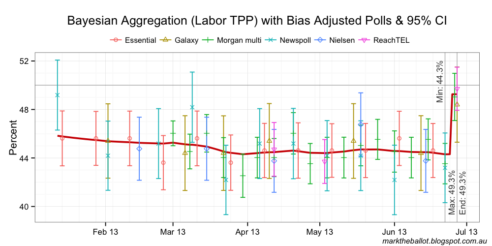 The bias adjusted polls are as follows. One of the three is close to 50 per cent TTP for Labor. Two are closer to 48 per cent.