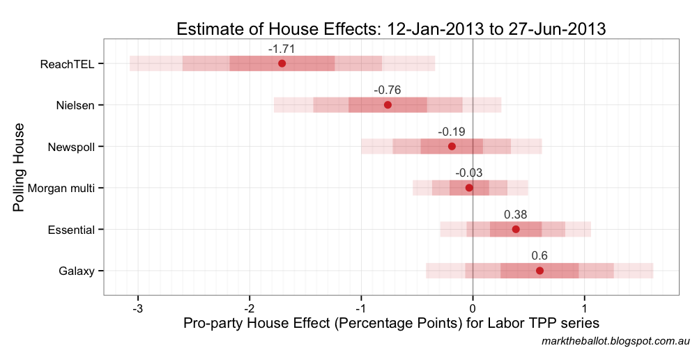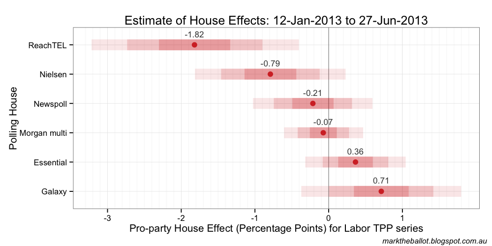 Because the ReachTEL series (with just three polls) appears to have a moderate Coalition bias, I have excluded it from the sum-to-zero constraint on house-effects (just like I previously excluded the Morgan face to face poll because of its Labor bias). I will review this decision when I have seen a few more ReachTEL polls.