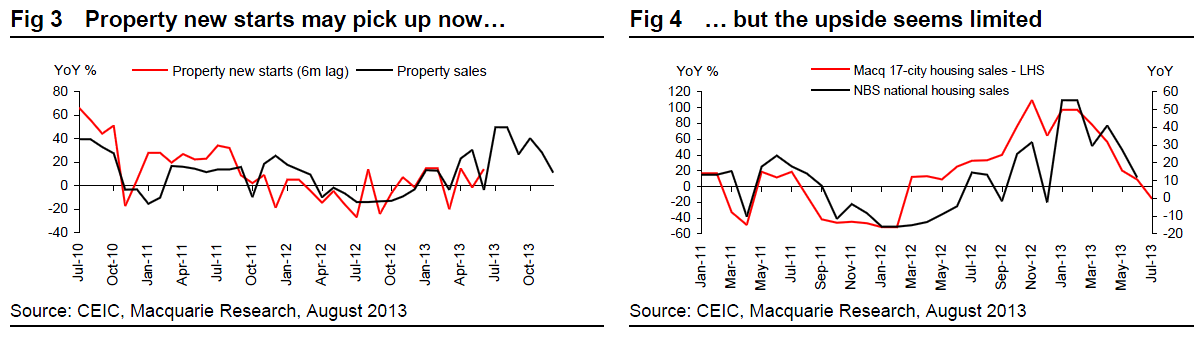 As property sales growth started to come down in March-April, the potential strength of construction activity could begin to wane into 4Q13. This thus fits well with our assumption that YoY growth figures may soften again in 4Q13.