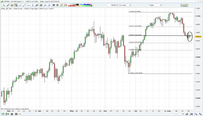 Europe looks to be getting off to a weaker start and could very well be in a holding pattern until we get into the FOMC minutes in the latter part of the session. The failure to close back above the 38.2% retracement of the 1560 to 1709 move at 1562.62 (see below) on the S&P 500 (the S&P 500 closed at 1652.35) is a bit of a concern for the bulls and shows momentum is starting to favour further downside, although we haven’t been given a strong sell signal yet. Today’s Fed minutes will be the key release then for today and will expand from the July FOMC statement, which was taken to be more dovish than expected at the time by the market. Whether we actually get any new information is what traders will be scouring the narrative for, and the areas of most interest involve heightened language around forward guidance and further concern around the risks around higher mortgage rates. We stick by our call that the September meeting will herald a clear sign of tapering, although given rhetoric from recent Fed officials this event could be fully announced in the October meeting (which could have an additional press conference) and likely lowered by a token amount to both US treasuries and mortgage-backed securities. This in turn could be tempered by a change in the current forward guidance instigated by Charles Evans.