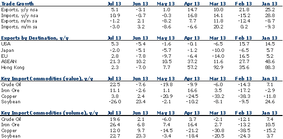 China’s trade growth rebounded in July with exports gaining 5.1% y/y and imports surging 10.9%. While the positive growth can be attributed to the low base last year, we believe an improvement in liquidity access in the aftermath of June’s cash crunch may have restored trading activities, resulting in the upside surprise in today’s release.