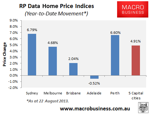 Since the end of last year, home values have risen by 4.91% at the 5-city level, with all markets except Adelaide experiencing gains (see next chart).