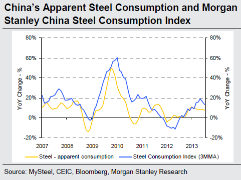 Iron ore continues to defy consensus expectations: So far this quarter, the CFR China import price index has averaged US$131/t vs. consensus expectations of US$115/t (Morgan Stanley: US$128/t). In our view, the unexpectedly high price is a function of 1) a tight spot cargo market; and more importantly 2) robust Chinese steel production growth, which is currently annualizing +10.4% YoY (vs. +3.7% YoY in 2012) and thus driving demand for iron ore as a result. This trend contrasts with lackluster demand growth in 1Q13 and raises the question as to where this output is going? This is a particularly important question as China is not exporting steel to an excessive degree, and steel inventory levels are continuing to decline, indicating a real increase offtake.