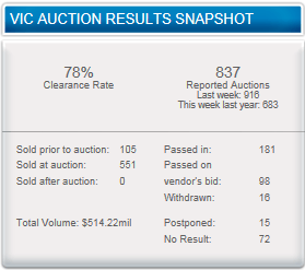 By way of comparison, RP Data’s auction results for Melbourne were slightly worse, with 77% of auctions clearing on 972 reported auctions (i.e. a bigger sample than the REIV).