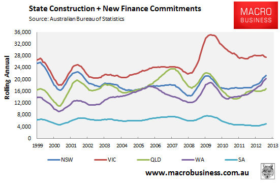 However, with land prices remaining stubbornly high, and state planning systems, taxation, and infrastructure provision remaining unfavourable towards new development, the overall improvement in new home construction is unlikely to be anywhere near enough to pick-up the slack left as the mining boom unwinds.